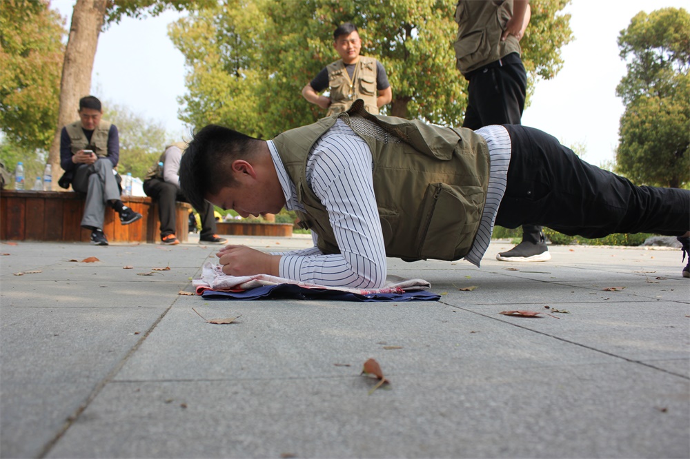 首先是翻葉子,這算是一個(gè)比較經(jīng)典的游戲了,每組隊(duì)員站在一塊布上,然后在所有人不得以身體任意部位碰到布以外的地方,把布翻過來??茨慕M時(shí)間最短。旨在提高大家的協(xié)作能力和團(tuán)隊(duì)精神。最終紅隊(duì)更勝一籌,穩(wěn)中求快就會(huì)勝利。